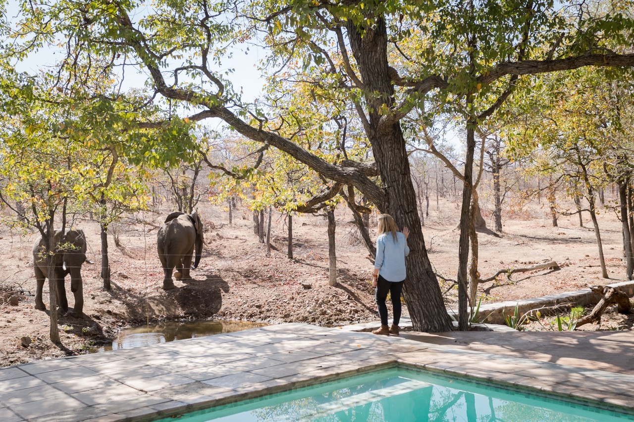 Regular visitors to nThambo Tree Camps pool are a herd of Ellies who love sliding their trunks in for a quick drink of clear, cool water during the drier months. Lounge in luxury amidst the wild.