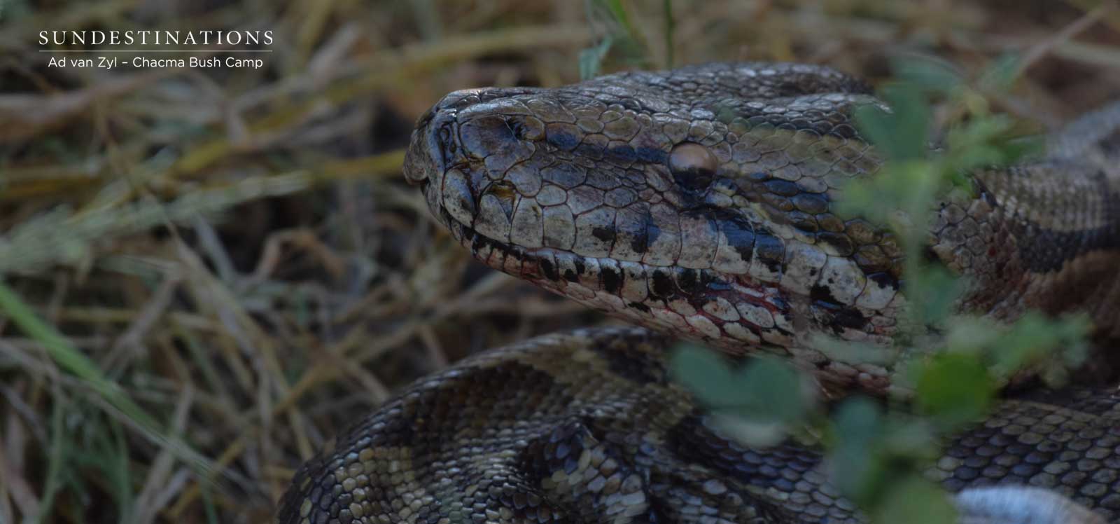 It’s always exciting when one of our guides sends through a video clip of an ambush predator in the throws of capturing its prey. When AD Van Zyl from Chacma Bush Camp WhatsApp’d me to tell me about a unique sighting while out on drive, I made an assumption that I was going to receive an influx of leopard videos and images. How wrong I was. AD spotted the unimaginable. The type of sighting that would make herpetologists and reptile loving safari-goers turn an envious shade of green mamba!