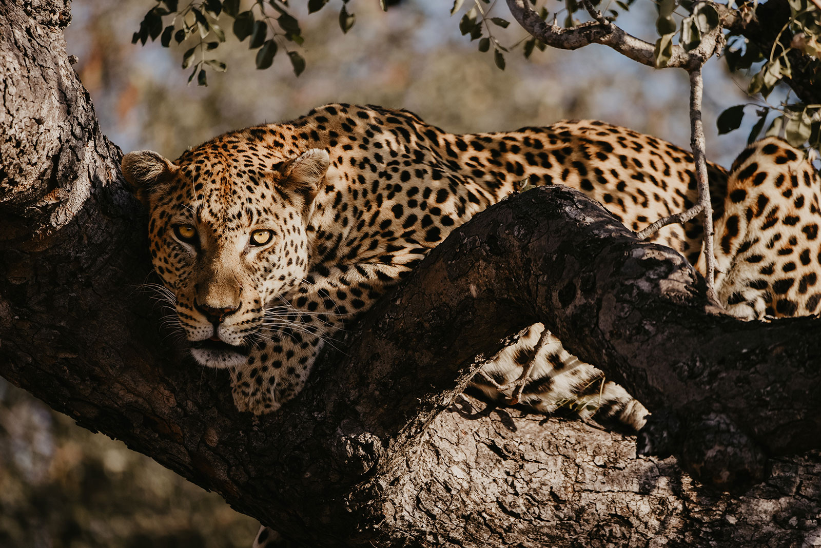 Another incredible and my most memorable sighting was when one morning we set off in search of a leopard who was in the area and not long after looking for a while Elmar suddenly stopped the car and said “I can’t believe it!” The leopard was peacefully lounging in a tree we were just about to drive passed! We watched him for a while and then moments later I captured my favourite image from the trip… As a photographer you’re always looking for eye contact with animals. It really builds a connection to the subject. The leopard started looking around and in a split second he turned and looked right at me! I think my heart might have skipped a beat as you can be waiting hours for a moment like this. This moment I will treasure forever.