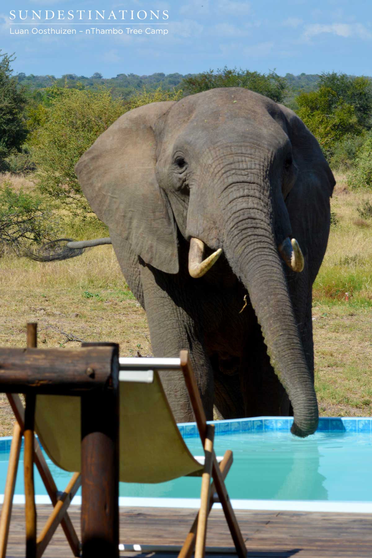 Guests at nThambo were treated to a couple of elephant visitors recently as they were whiling away the afternoon on the deck. The plunge pool located at the main lodge is lined with sun loungers offering the perfect place for a G n T and a good book, but during the hot summer months it looks like it is a popular spot for the wildlife too!