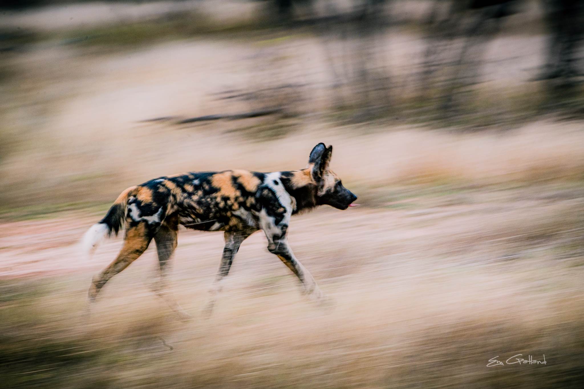 During the denning period (May – June), dogs are more sedentary, confining themselves to the area where the pups are stashed. This is when the majority of sightings happen with safari-goers out on game drive. Disused aardvark burrows or abandoned warthog burrows are typically used to stash pups.