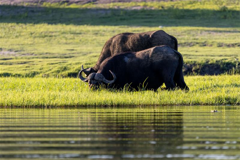 Buffalo males are already known for their aggressive behaviour which is amplified even more during this period. Mating involves intense competition between bulls. Males will engage in sparring to compete which often brief but violent. A dominant bull is often recognizable by the thickness of his horns. Female buffalo are pregnant for about 11.5 months so give birth during the summer too. Interestingly, within a herd, many buffalo cows tend to synchronize their estrus cycles with the rainy season (aptly referred to as Green Season!) as this is when grazing is best. Males play no role in the rearing of the calves except aiding in the herd protection while females form intense and long relationships with their calves and will suckle for up to one year.