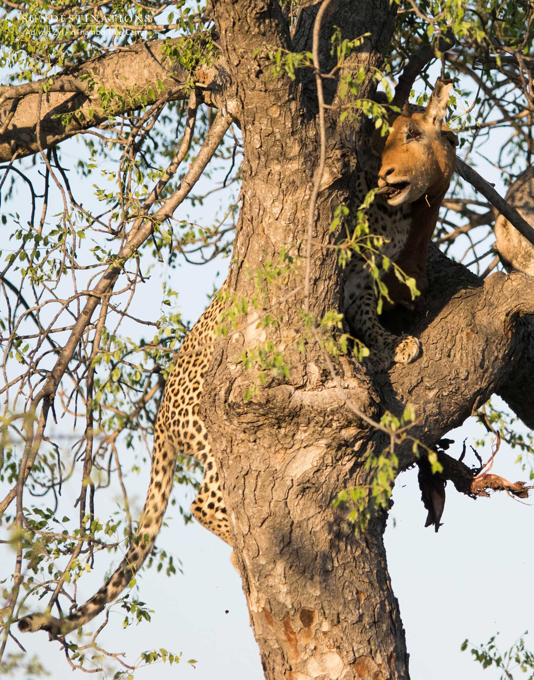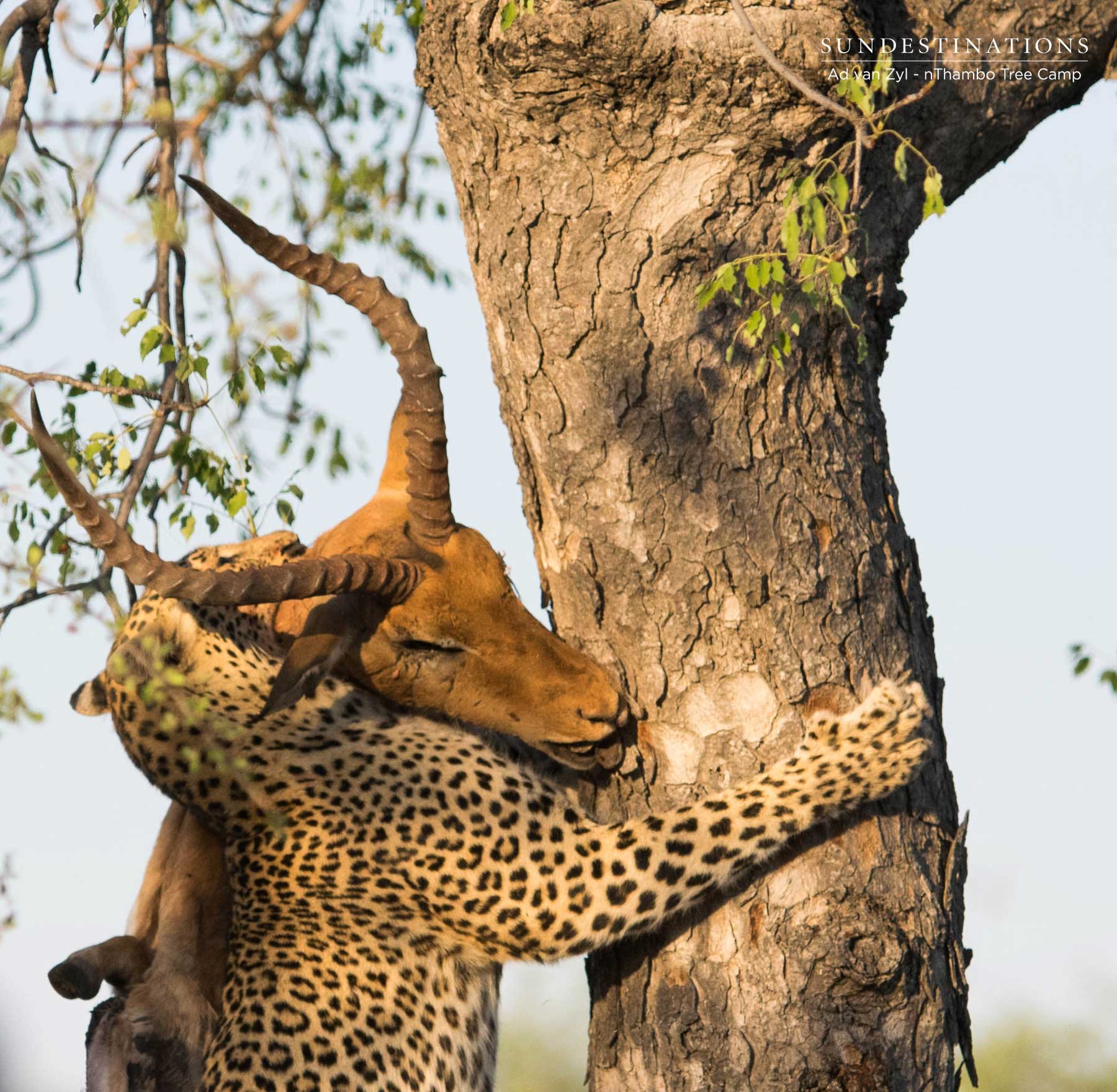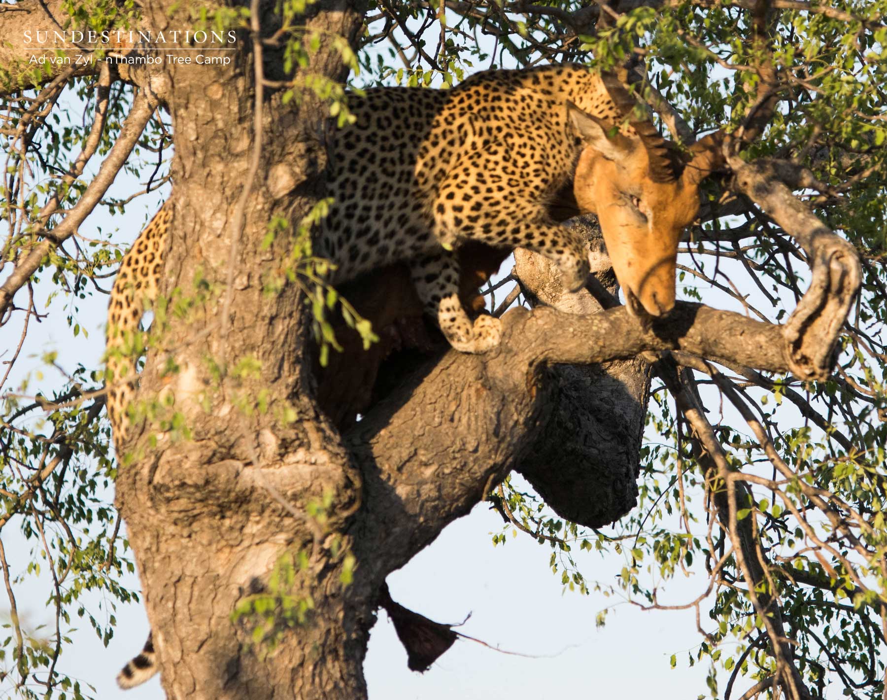 Once the kill has been made, a leopard will need to drag its prey to safety before the scavengers and other predators get wind of the fresh meal. They will normally hoist their kill high up in the tree, or hide it in dense bushes. Leopards can be opportunistic and will steal prey, provided the conditions are non-threatening – leopards are not normally confrontational.