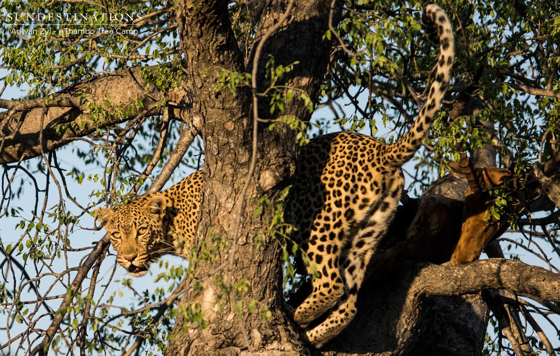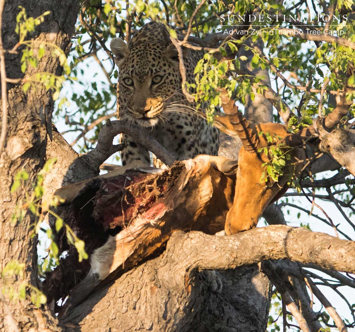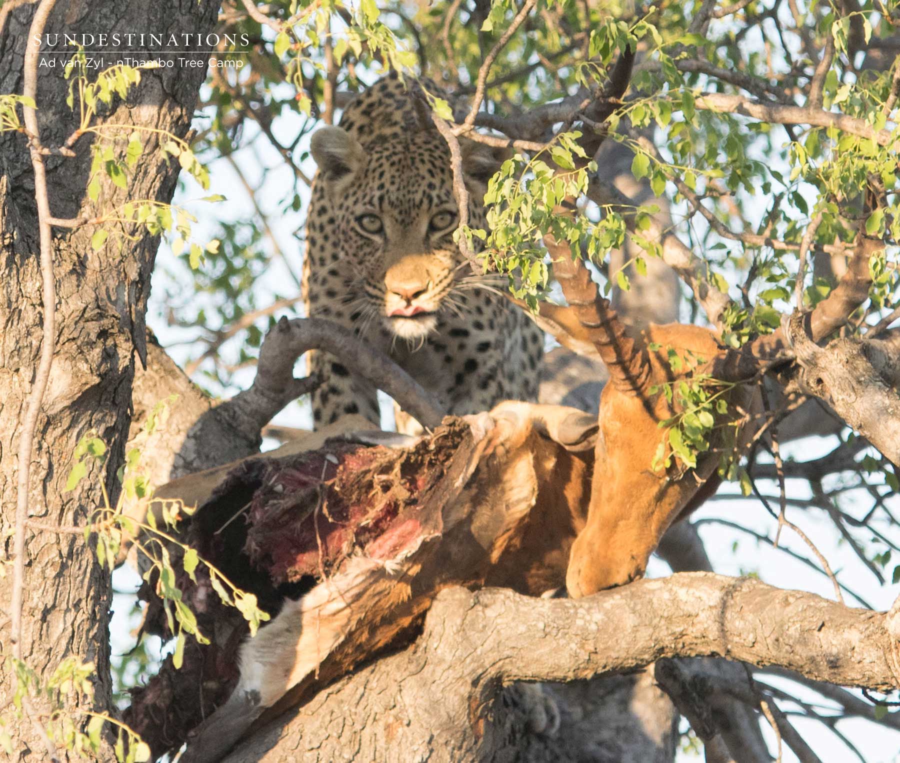 Once the kill has been made, a leopard will need to drag its prey to safety before the scavengers and other predators get wind of the fresh meal. They will normally hoist their kill high up in the tree, or hide it in dense bushes. Leopards can be opportunistic and will steal prey, provided the conditions are non-threatening – leopards are not normally confrontational.
