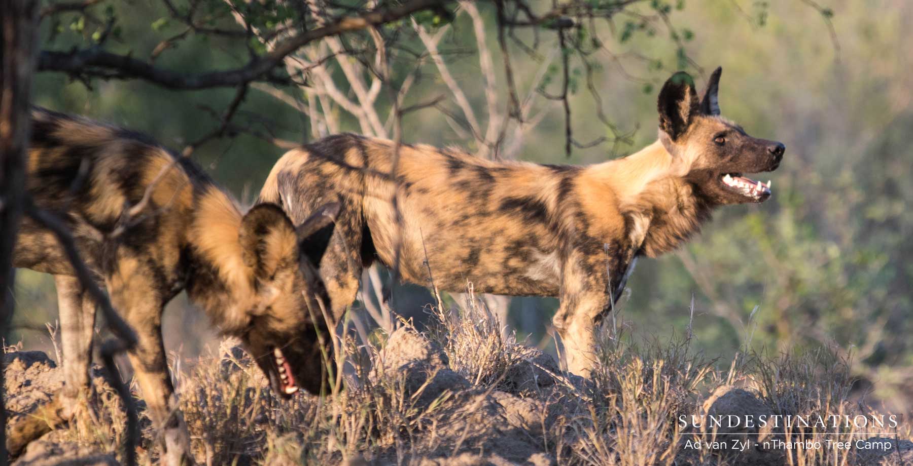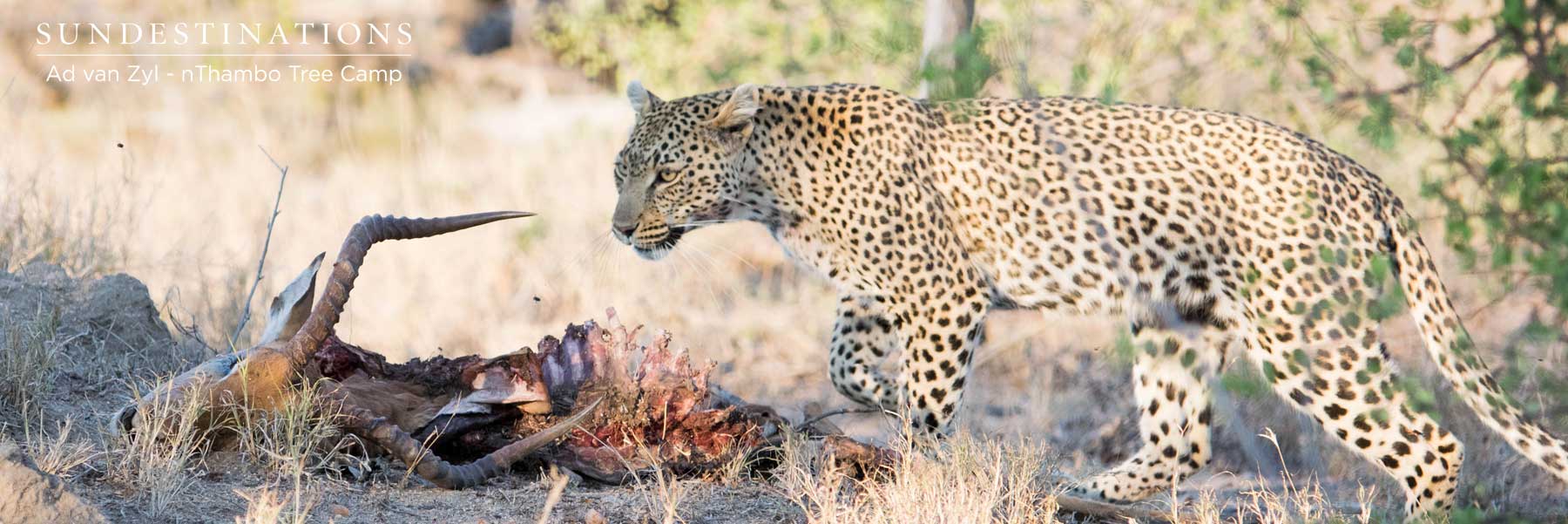 Two species. One sighting. Both vastly different in their take down of quarry and execution of kill tactics. This is the story of how local leopardess Ross Dam had her fragmented carcass stolen by a pack of unscrupulous wild dogs. Only the marula tree where she sought refuge will know the true version of events that unfolded in this section of land that borders the confines of our traverse. Africa on Foot and nThambo Tree Camp witnessed the scuffle as it began, but what happened before the untimely death of the impala kill will forever remain a mystery stashed into the vault of stories that the bushveld holds.