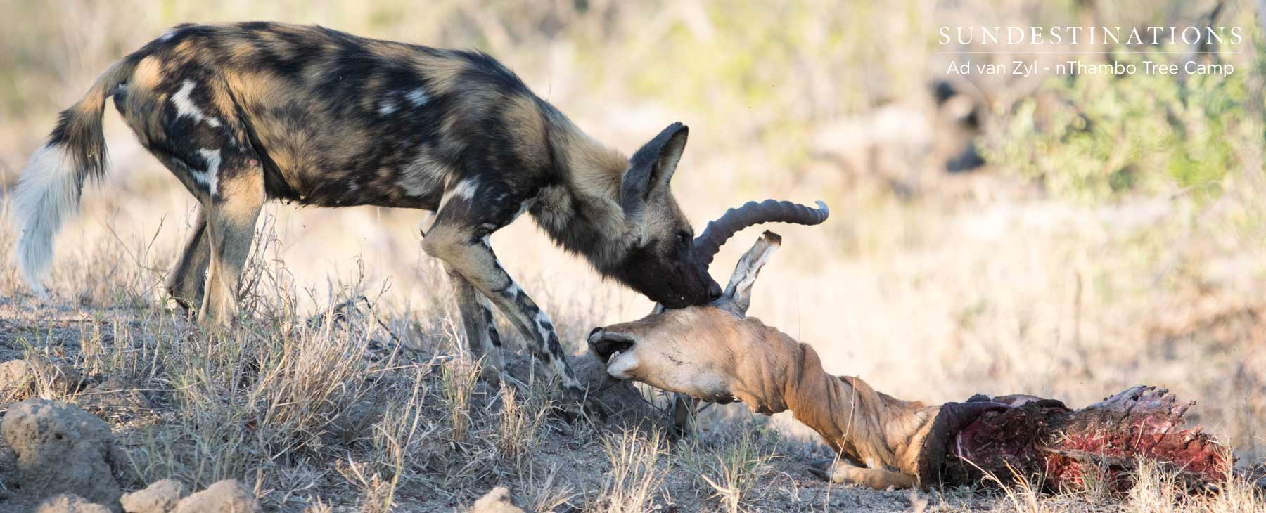 Their hunting skills are like a well-oiled machine, but one that thrives on blatant behaviour. Dogs will simply identify a weaker or younger member in the herd, walk straight towards their target and a chase will ensue. Identify – pause – engage. A string of behaviour typical to animals that are classified as sighthounds. Wild dogs are coursers and will chase their prey until the point of exhaustion, after which they will attempt to disembowel their prey. Despite the kill method sounding rather sadistic, the prey actually dies quite quickly. Like most wild animals, if dogs come across a free carcass without having to conduct a kill, they will naturally attempt to eat it and displace other predators from the carcass.