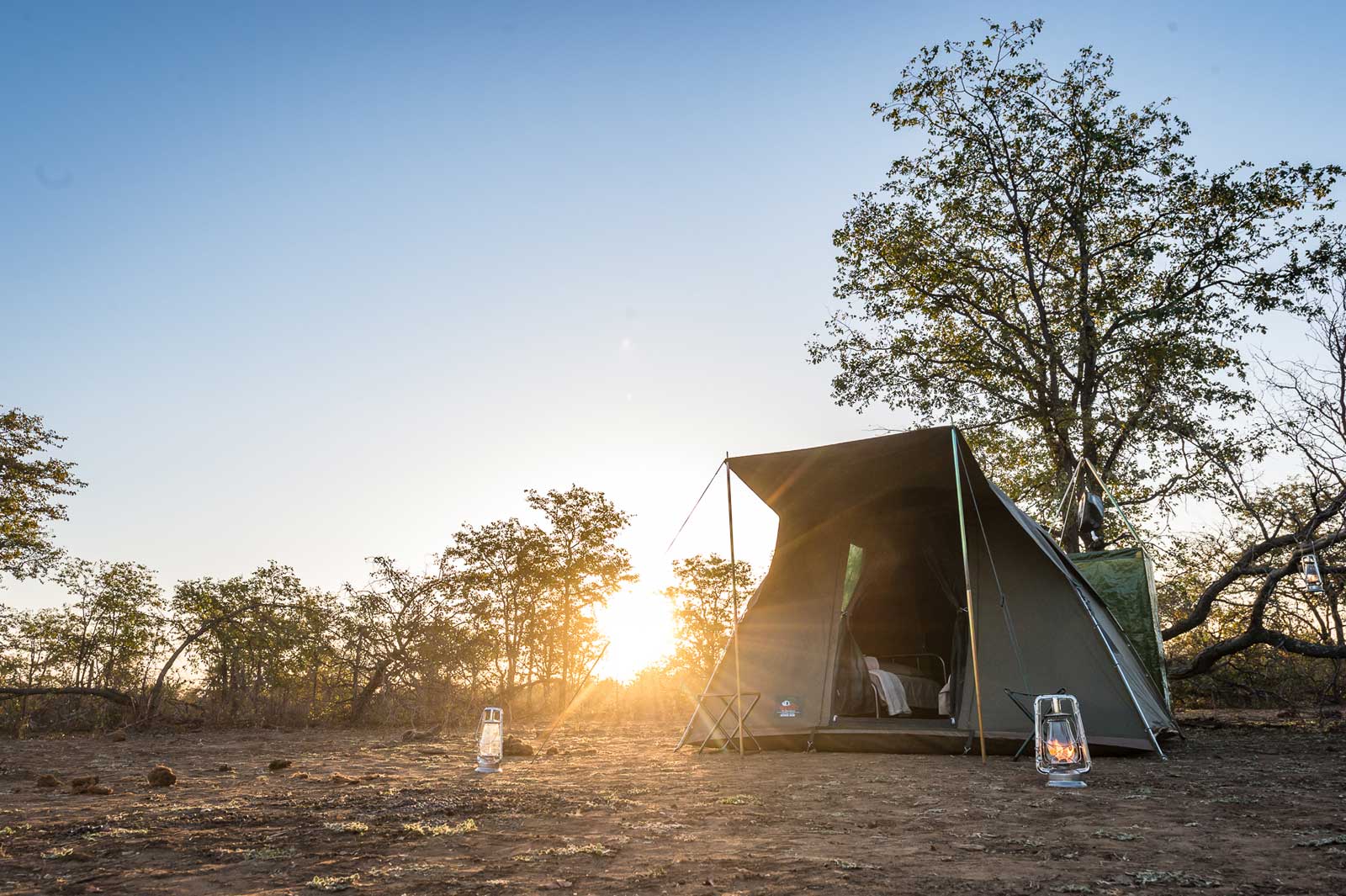 The canvas exterior of the tent is lined with fly screen mesh, which allows the canvas flaps to be opened while keeping the insects out. Home comforts, such as bug spray and mosquito repellant, hand soap, and toilet paper are provided.