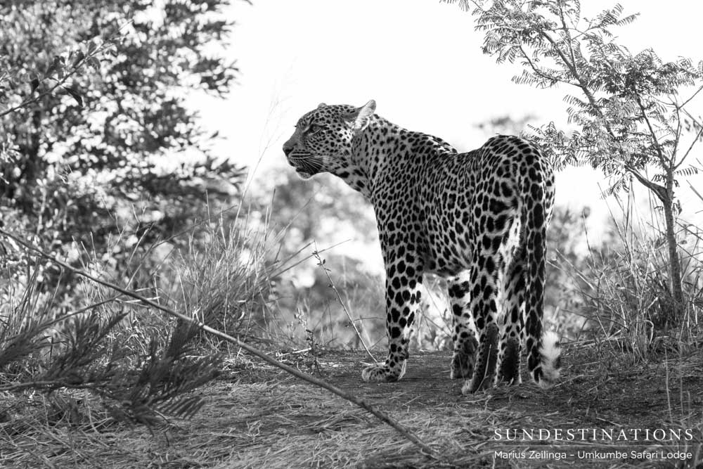 White Dam has 2 cubs we know of – a male and a female, but she has been seen solo these days as her cubs are semi-grown. The last few times Umkumbe guests have sighted her, she has been attempting to hunt, but has not been successful. This is no indication of her leopard’s skill or strength, but it is a reminder that even a cat as powerful and stealthy as a leopard has a highly unsuccessful kill rate, and only manages to kill 25% of the medium-size prey animals they stalk.