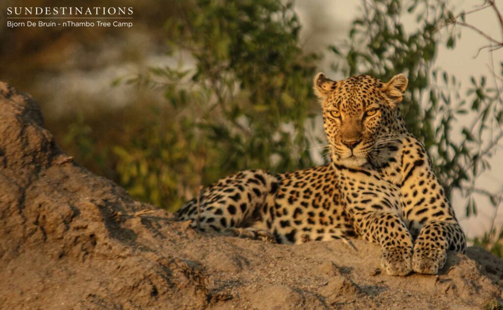 Typically, leopards like to climb trees or recline on anything at a height, and termites certainly fall into that category. Cleo is not bothered by the presence of the Africa on Foot and nThambo Tree Camp vehicles, and allows us to sit and admire her for ages. The late afternoon sun is pleasant at this time of year when temperatures are cooler, and she seemed to be enjoying the last of it before the call of the night gets her up to hunt. Just another fantastic leopard sighting for the books!