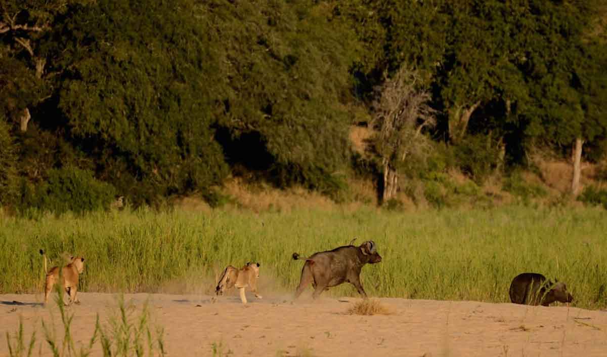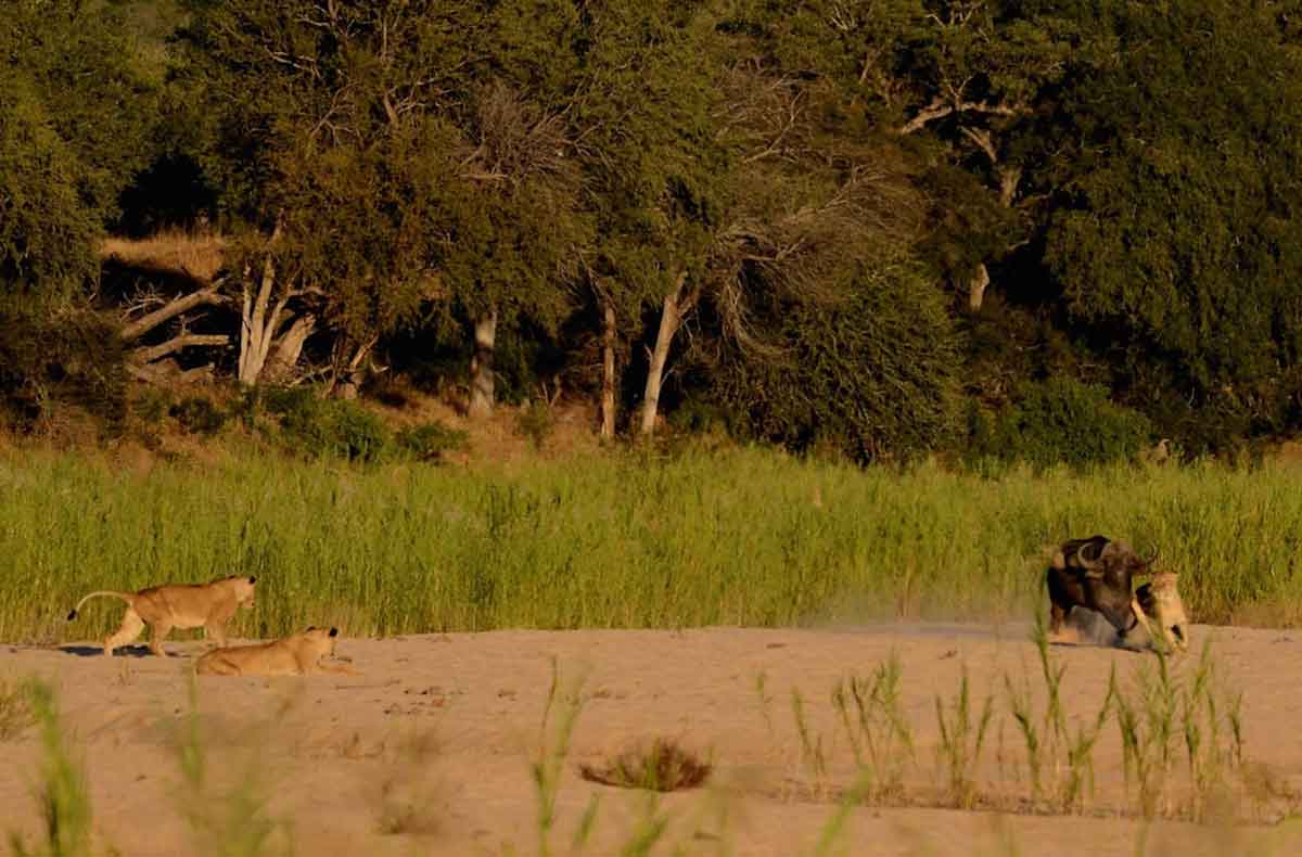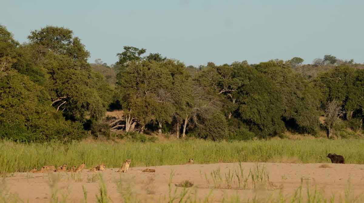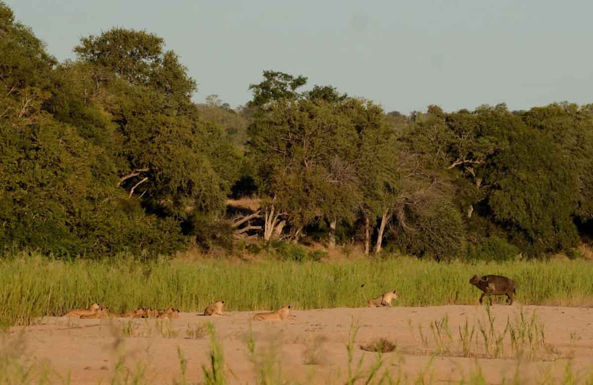 One such noteworthy sighting happened a few days on the sandbank of the river in front of Umkumbe. Guests didn’t have to travel far to see the entire Kambula Pride of lions together with their cubs. The pride were just chilling out, sprawling their bodies in the soft luxurious sand when they were interrupted by a herd of burly bovines.