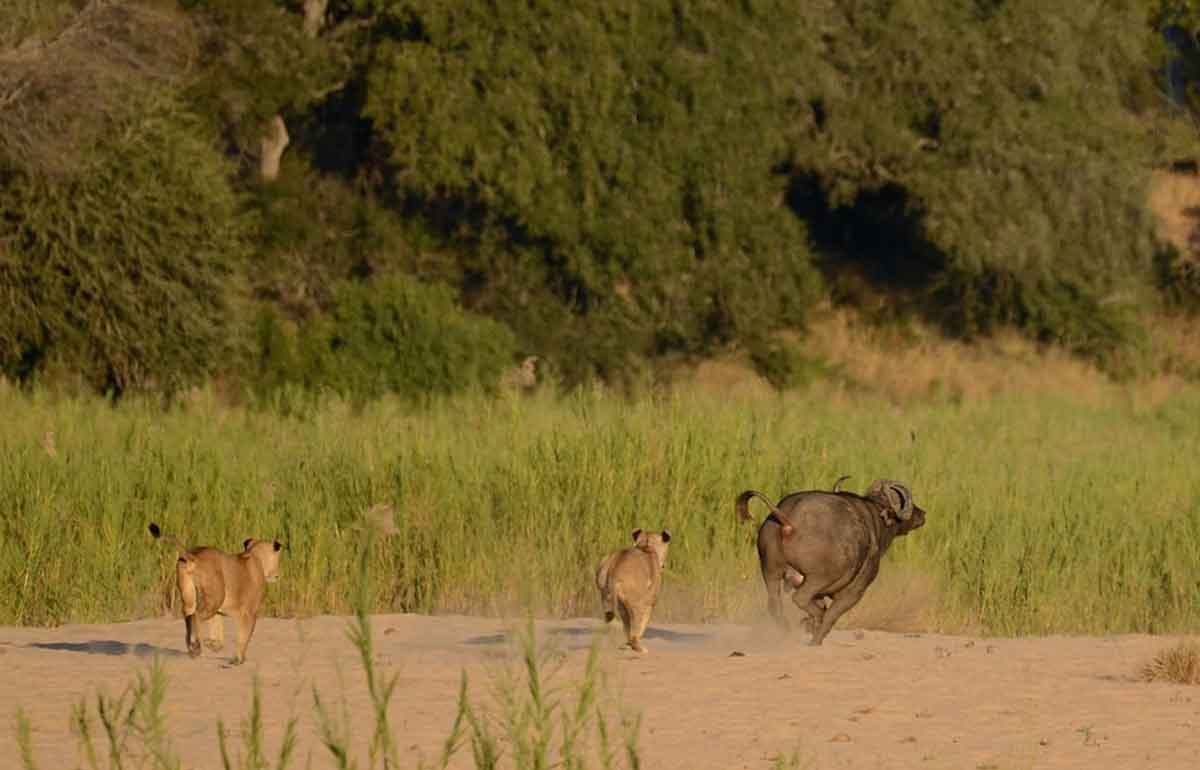 The cubs are still young and need plenty of protection from the elements. It’s not uncommon for lion cubs to get trampled to death by heavy-hoofed buffalo and lumbering elephants. Not to mention the threat of predators and scavengers. In this instance, the buffalo were hovering and bulk grazing in the area. The pride appeared to fear for the cubs’ safety, so a scuffle ensued. Hurricanes of sand and aggressive behaviour followed after the buffalo approached. The older members of the pride attempted to take down one of the buffalo – a brave move. Not only was there an attempt to frighten off the mafia-looking buffalo with a few scare tactics, but there was also a quick attempt at a take down. Ultimate opportunists !