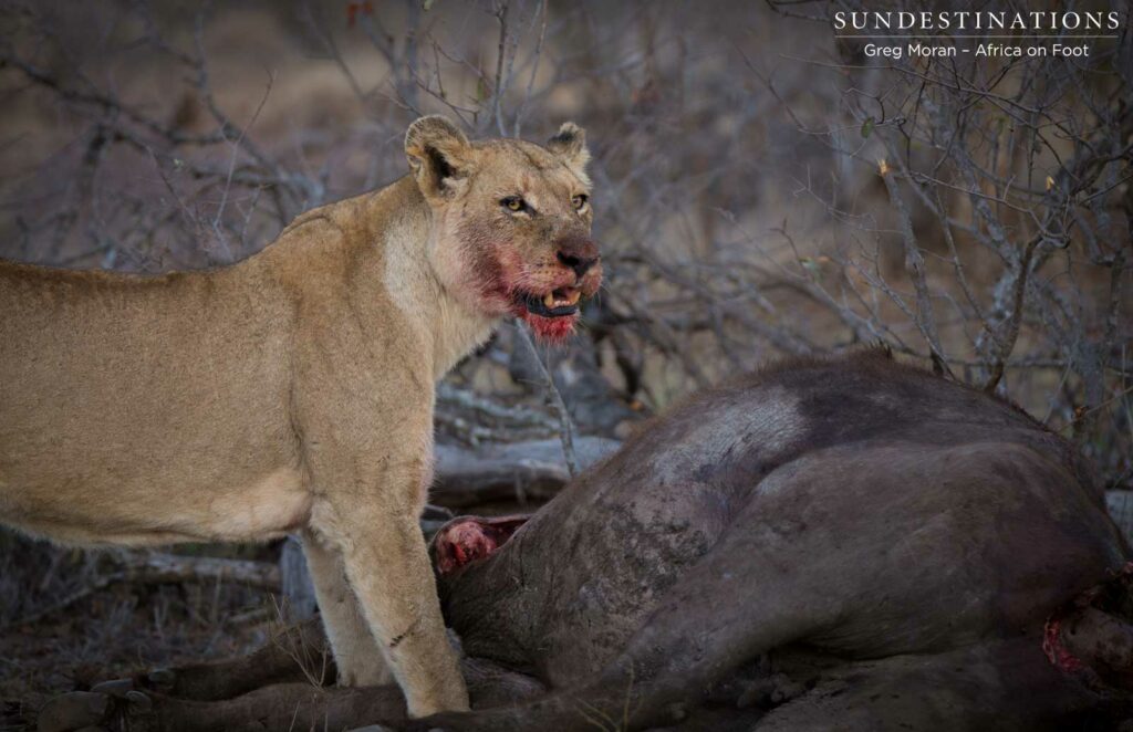 This morning’s safari activities at Africa on Foot began extra early when everyone in camp was woken up by an animal commotion at 04h30! The unmistakable sound of a buffalo in distress bellowed through the darkness, while the determined growls of lions making a kill added to the frightening calls. Quick as a flash, the rangers were up and piled into the game viewer, breathless with anticipation. The site of the action was right in the middle of Africa on Foot camp, between the rangers’ block and the treehouse… where two Africa on Foot guests had spent the night! Watch Kevin’s interview with them after the event, here.