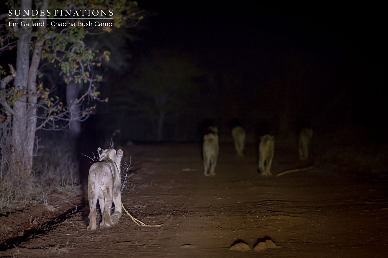 6 burgeoning young male lions were spotted cruising down the rocky gravel road in the Maseke Game Reserve. Their swag displayed a sense of youthful confidence and powerhouse of formidable strength. This appears to be their kingdom, and they rule it with a dominant  attitude. Our Maseke lion sightings have only been of this male coalition, which begs the question – where are the females? Male lions normally seek our territory with a ready availability of food, water and females! Young males want to continue their bloodline and will seek females to conquer and prides to take over. Lionesses tend to stay in their natal prides for life, and may split-off into sub-groups.