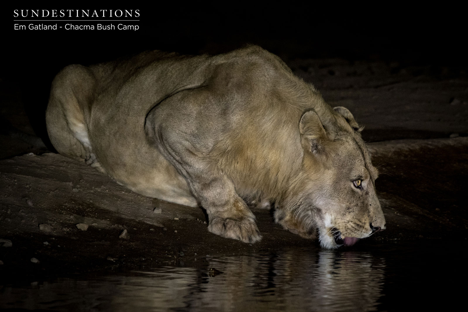 Shortly after the this sighting, 4 of the males were spotted tucking into a buffalo kill. We managed to spend over an hour with the coalition, watching the boys gorge themselves on their meaty meal. The following day, a large lone male was seen enjoying a bit of solitude with the kill. He seems to be older than his counterparts, and has a more prominent mane. A few days later in the early hours of morning, this same male was spotted replenishing his thirst on the banks of the waterhole.