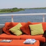The rooftop of the houseboat projects astonishing views of the plethora of wildlife ambling through the long grass, while melodic calls sound through the still swamp air and fish slice through the waters beneath. Overnighting on a small island interrupting the waterways is an adventurous and unique experience, guests are surrounded by grunting hippos, bellowing baboons, and feeding elephants; singing an indigenously African lullaby.