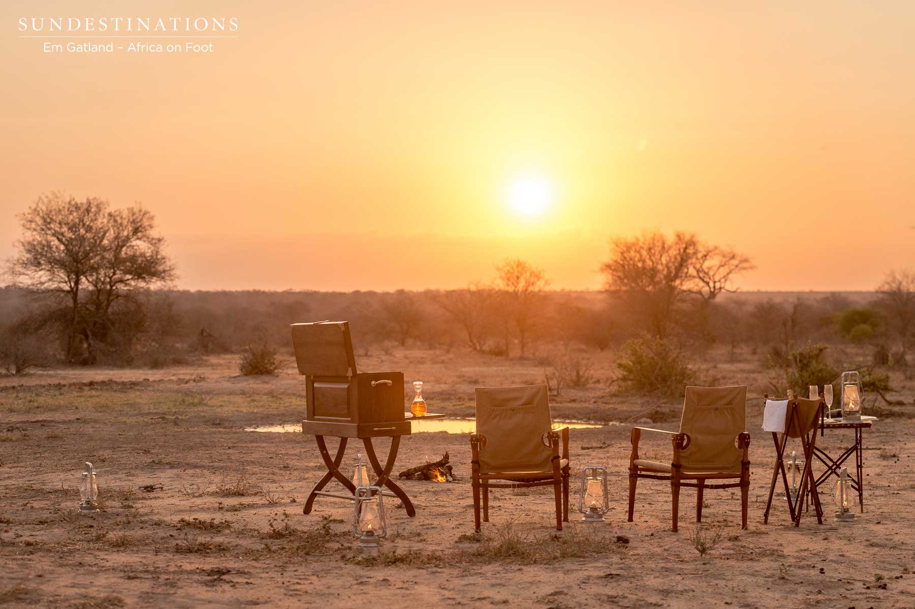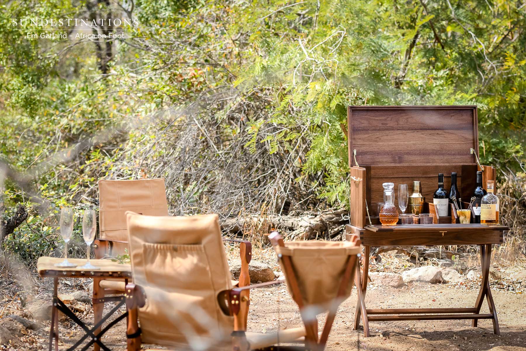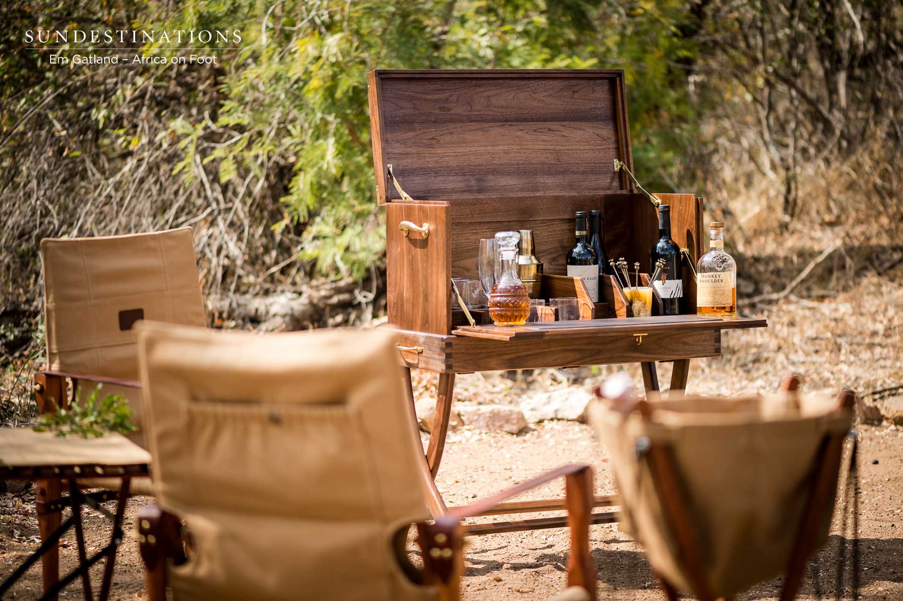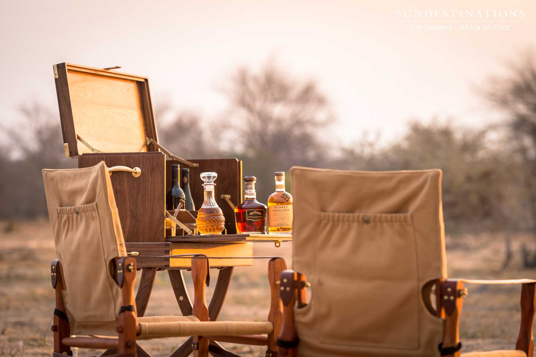 Imagine a sophisticated honeymoon sundowner experience that marries harmonious scenic surrounds with bushveld elegance. Our latest added value safari experience lets you indulge in a unique, pre-arranged sundowner escape with a touch of safari style that lends itself to an atmosphere of a bygone era – where things were traditional and classic. This is the ultimate intimate sundowner experience for those die-hard romantics that desire an iconic safari experience combined with practical decor elements to enhance the much celebrated of golden hour. While you’re cheers-ing to a blissful life ahead with your glass of fine champagne and the trumpeting of elephants in the background, we ensure that your entire bar, seating and sundowner set-up are furnished with the latest products from Melvill & Moon – purveyors of high-end craftsmanship and handmade safari gear.