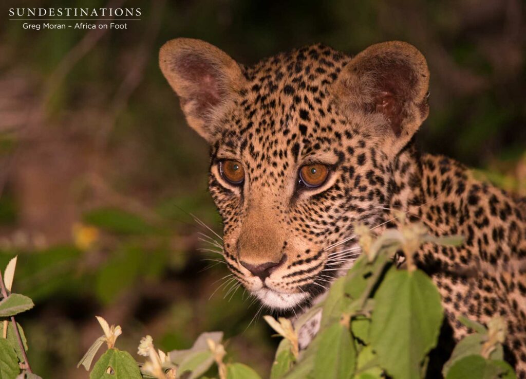 How do you top this? A leopard sighting on its own is something to smile long and hard about, but when you follow the distinctive alarm call of a jackal and arrive at a full family of these elusive spotted cats, you really count yourself lucky! Exactly this happened when guests at Africa on Foot guests interrupted their dinner at the lodge to follow up on a noisy jackal calling not far from the lodge. Greg and Enoch knew unmistakably that the jackal was alerting the night to the presence of a leopard, so they packed their guests back into the game viewer and followed the sound of the alarm call. It didn’t take long to arrive at the incredible scene and see Ross Dam female with not only one, but two leopard cubs!