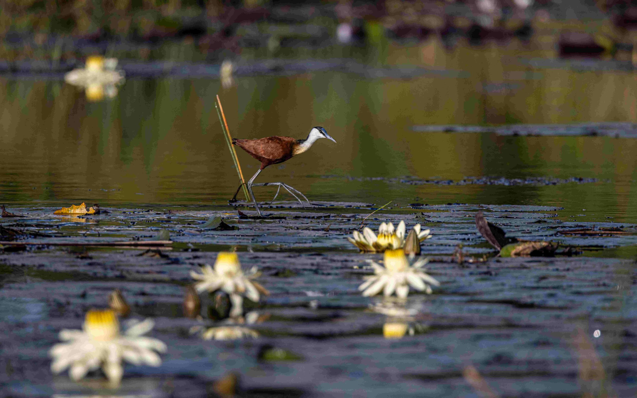 Frequently referred to as the “Jesus” bird because of its ability to dance gracefully across the waters, the aquatic African Jacana is a common, but notable species to spot while on a birding safari with Mboma Island Expeditions. You might hear these wading birds before you see them—they are exceptionally loud birds that make raspy barks and shrieks! With their long toes that are designed to cut through lily pads with ease, the African Jacana is certainly born to live in the waterways.