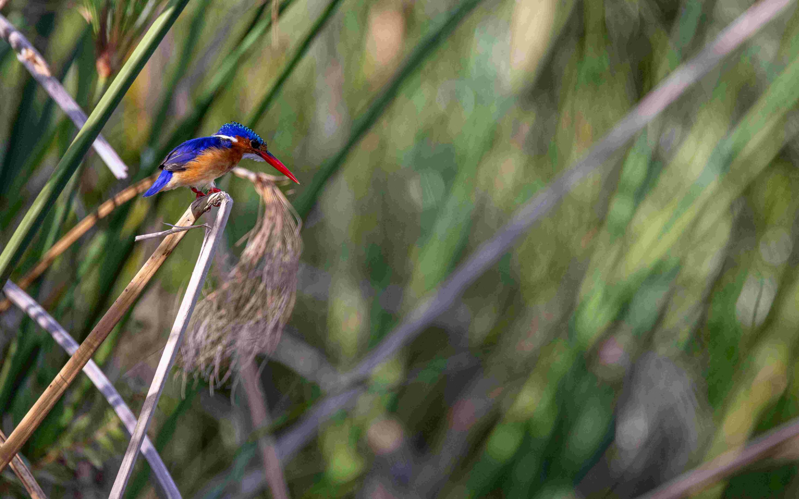 The iridescent royal blue and confident red colours of the exceptionally striking Malachite kingfisher, makes it one of the most easily identifiable kingfishers in the Okavango Delta. If you look close enough you’ll notice a few lilac, light blue and greenish hues that glow graciously in the light. Don’t be fooled by the Malachite’s beauty – it’s a tough and resilient bird, despite it’s tiny stature. They stand proud on a regular perch on branches or reeds above waterways and rivers; and nest in sandy tunnels on riverbanks.