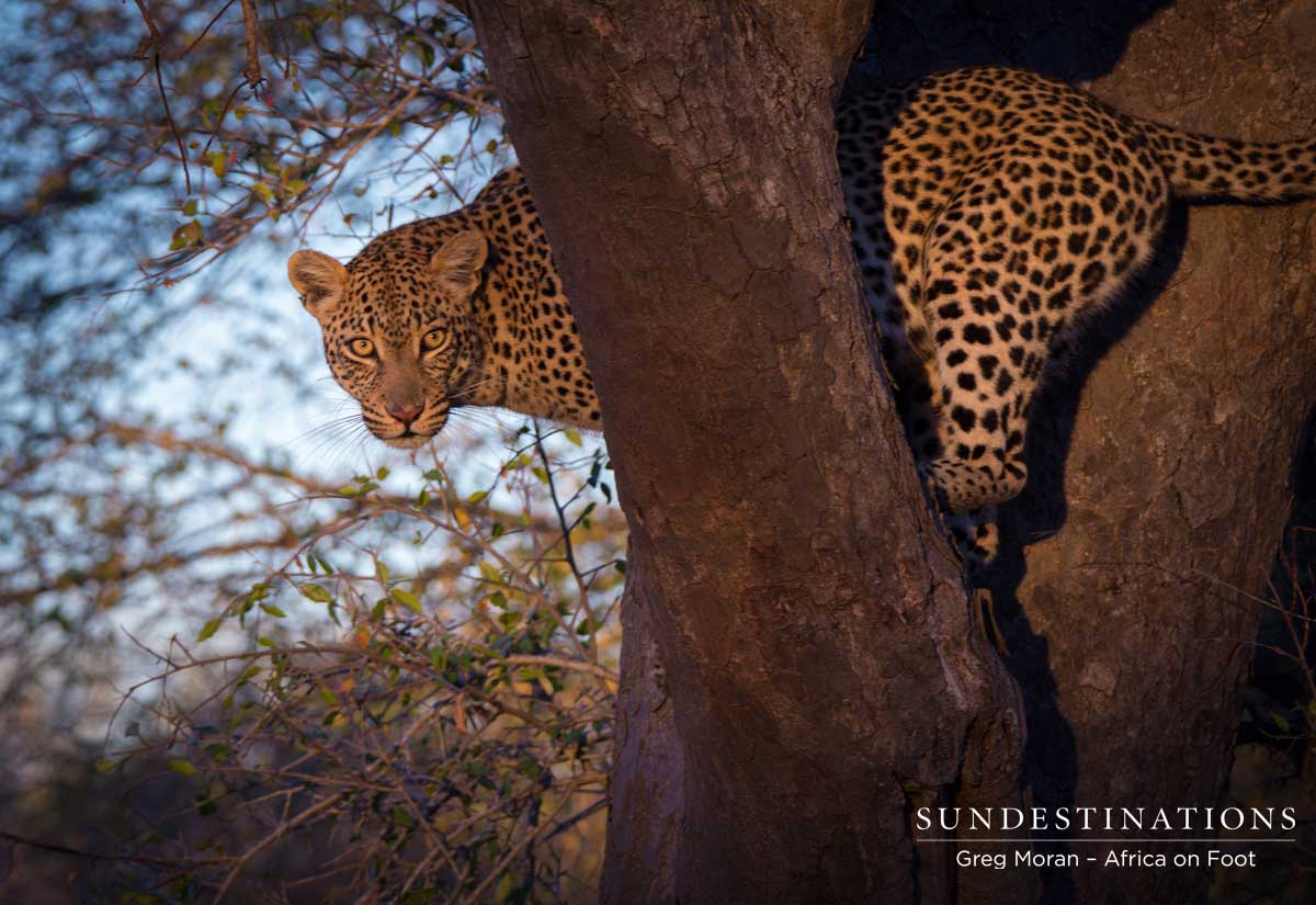 3. Eventually, after significant stalking, darting and taking cover, Ross Dam ambushed the hyena. Out of pure anger and the innate need to feed her cubs, she grabbed the kill from the hyena and headed towards a false Marula tree. She stashed stashed the kill neatly and compactly in the fork of the tree for safekeeping. Guests and rangers managed to observe her for a few minutes while she spent time securing her kill away from the prying eyes of scavengers.
