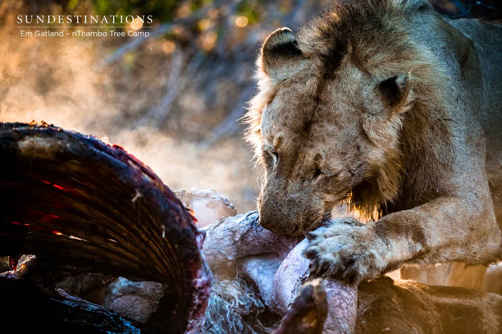 Africa on Foot and nThambo Tree Camp enjoyed 24 hours of noteworthy sightings, the fragments of which we’re still enjoying. Friday things were ticking along nicely, and come Monday a flood of insane wildlife reports littered the airwaves. In a space of 24 hours guides at camp spotted 3 cheetah relaxing after a recent kill (their matted bloodied fur was a “dead” giveaway), 6 bloated lions tucking into a massive meaty giraffe, and 15 wild dog puppies huddling together on the road. And these were just the highlights!