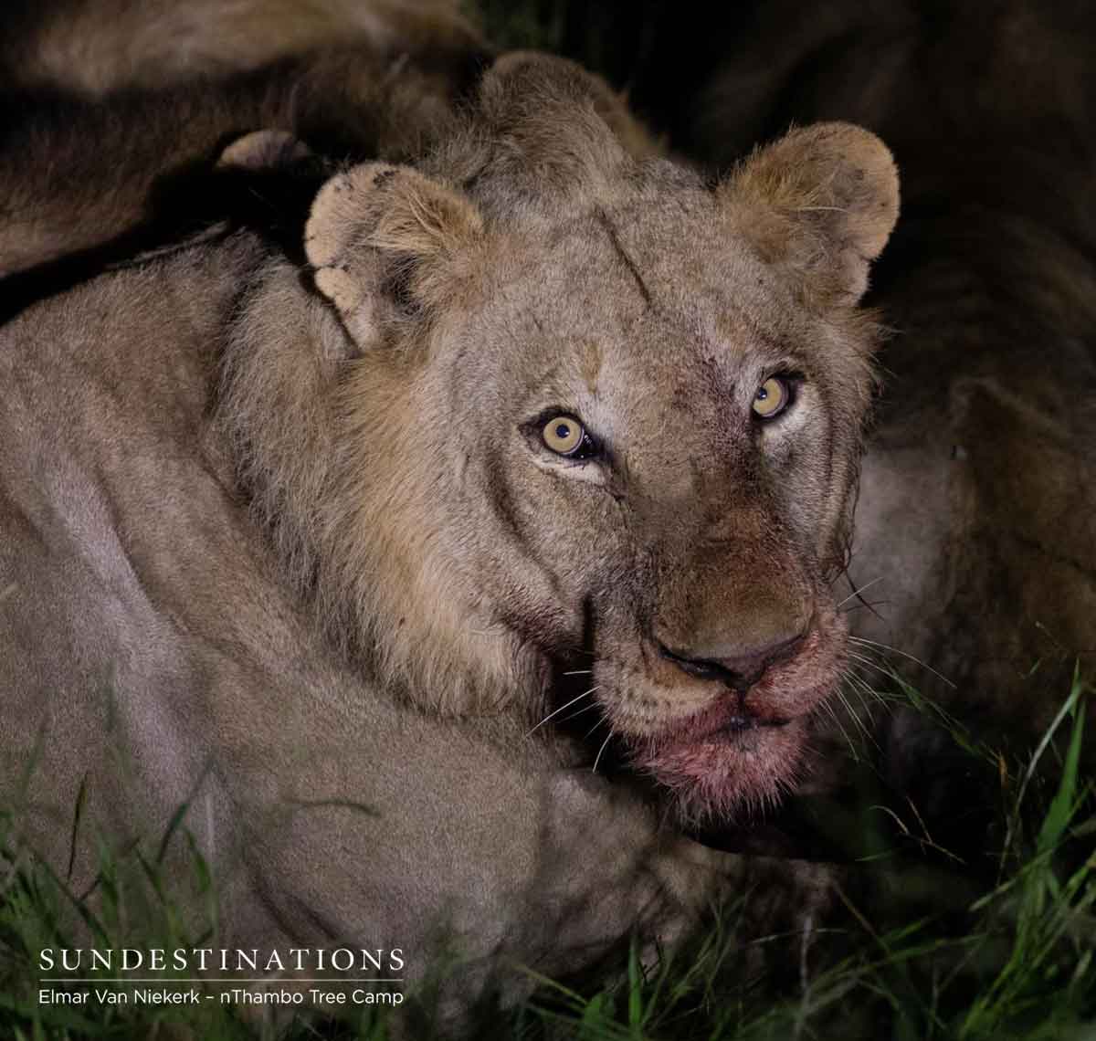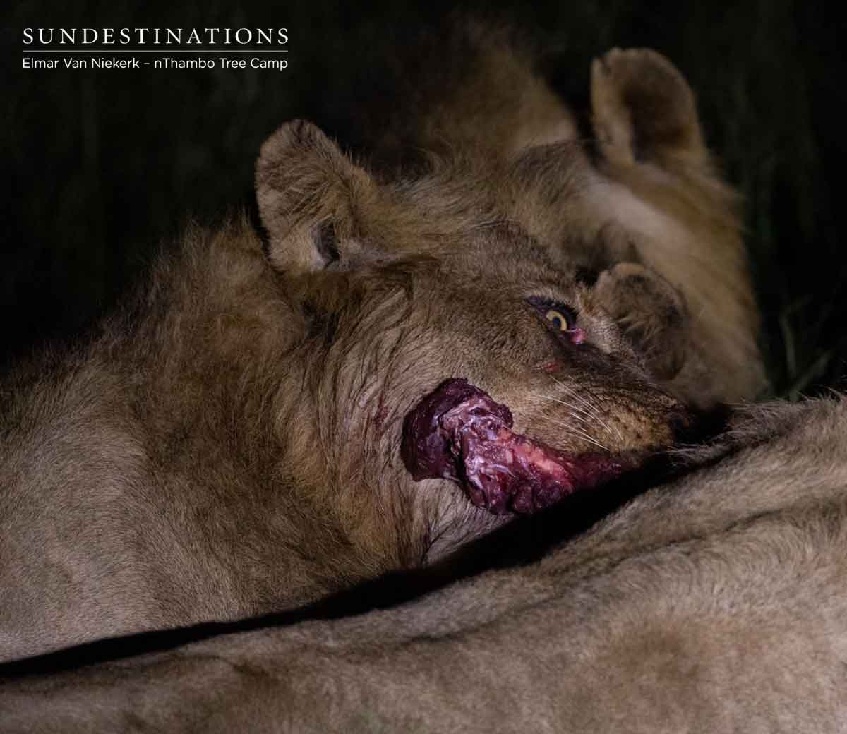 The Klaserie teams enjoyed an endearing sighting of jackal pups, which Rogan managed to capture on camera. However, the most enthralling sighting was seeing the Vuyela coalition in action. The lions ripped into their young wildebeest kill, shredding the carcass with such vigour. Crimson flesh was flying and tufts of hair were ruthlessly torn apart.