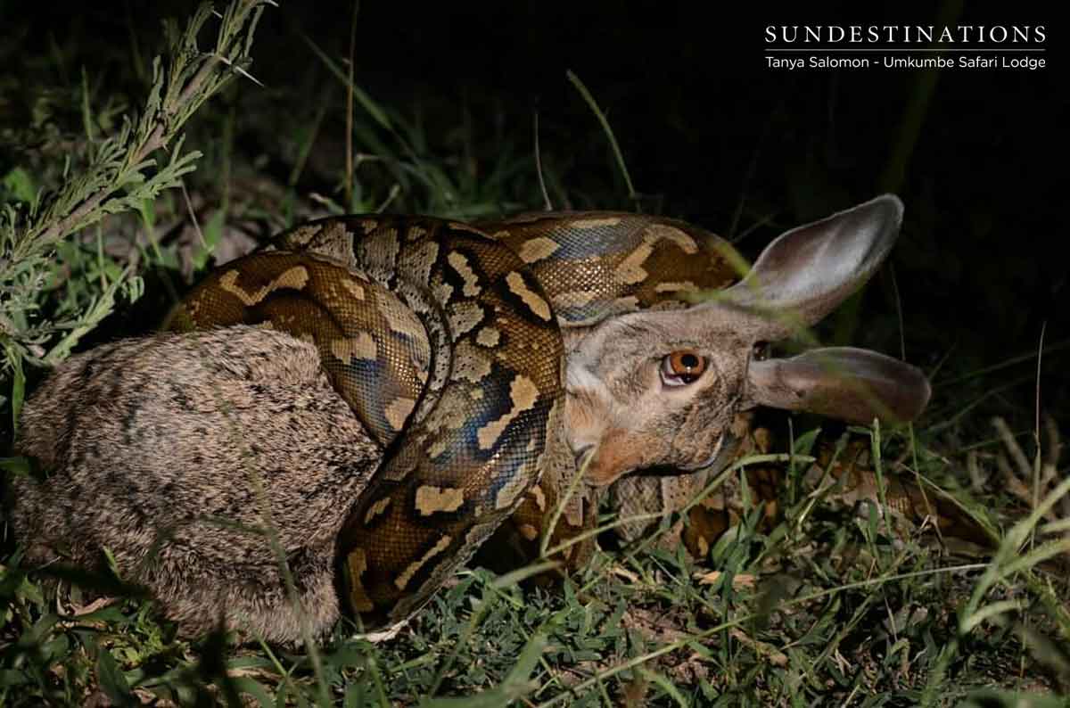 Umkumbe is fairly consistent with its stream of leopard and big cat sightings. Recent guests enjoyed a sighting of a massive leopard carrying its kill across the plains. But the sighting of the week has to be the sighting of an African rock python suffocating a scrub hare. Tanya’s image really evoked so many emotions, and is definitely our wildlife image of the week.