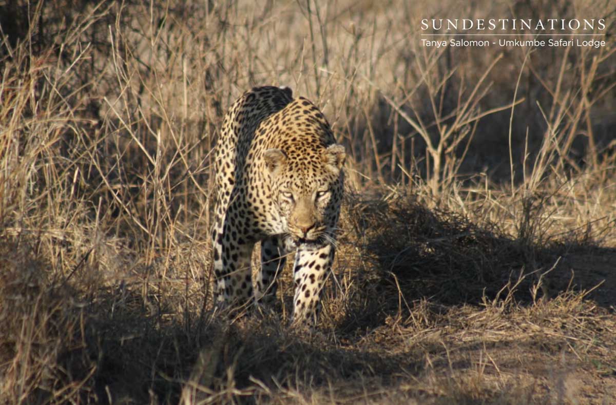 In one corner we have virile and agile youngster Nweti, filled with bravado. In the other corner we have the wise gentleman, Inyathini, filled with experience and stamina. These two testosterone fuelled leopards have declared war, and there’s a prickly tensioned filled atmosphere when we’re in the company of these two contestants. We use the word contestants, because really that’s what they are. What we are witnessing on the outskirts of Umkumbe Safari Lodge is typical male leopard behaviour – a fight over land ownership.  Ultimately, this is what causes warfare between male leopards. Which is exactly what’s happening between young Nweti and legend Inyathini. Nweti wants Inyathini’s territory. These are interesting times on the Umkumbe traverse!