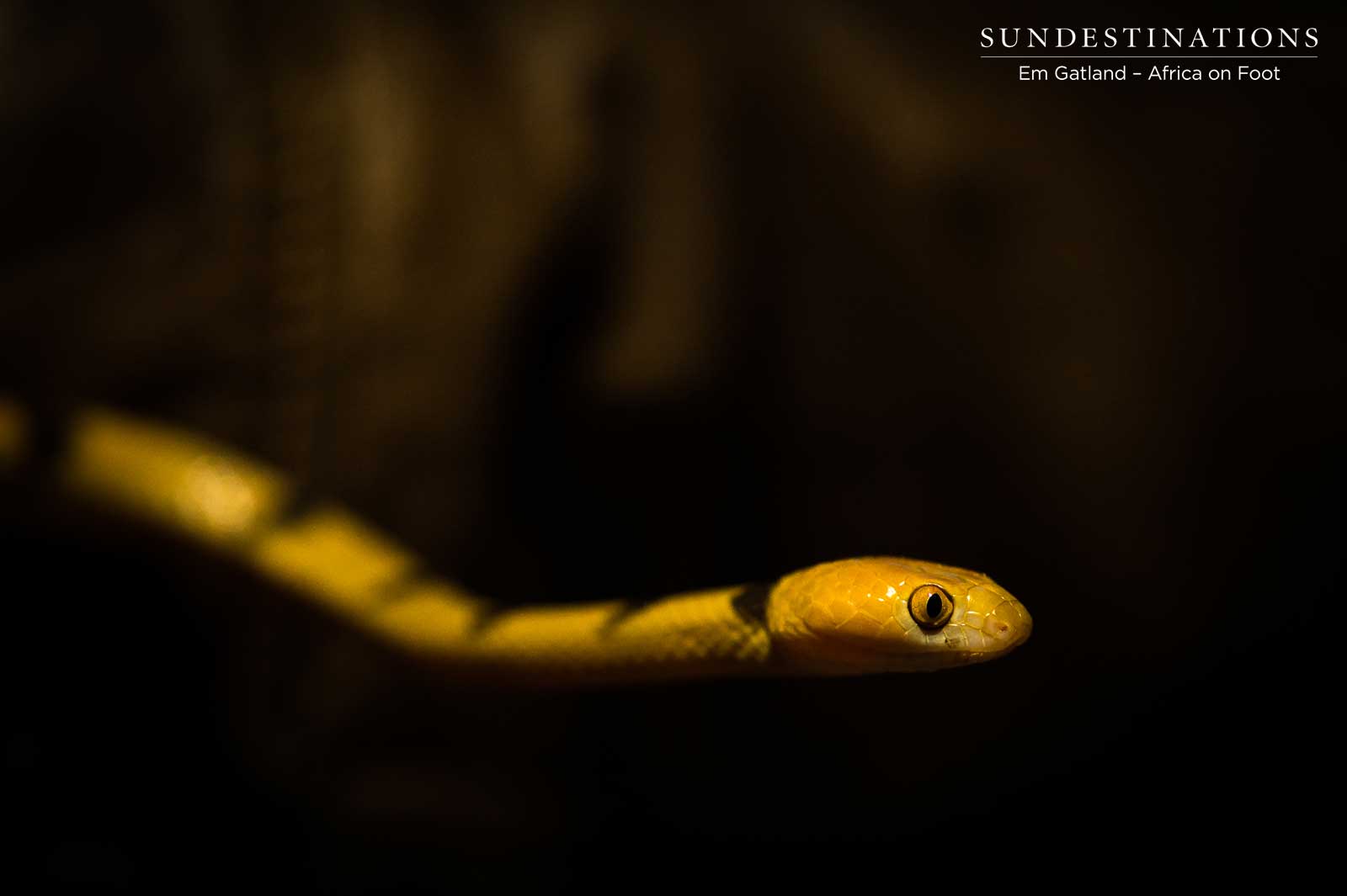 While out on game drive with Africa on Foot, photographer/videographer and passionate guide Kevin MacLaughlin spotted a common tiger snake in the darkness. Its burnt orange colourings with typical banded markings reflect similar markings to that of a tiger – a dead giveaway to the type of snake species.