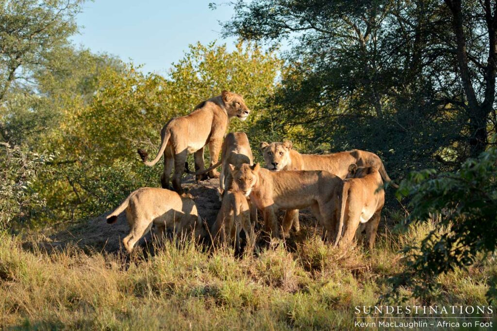 Africa on Foot guests were split between those who wanted to walk and those who wanted to enjoy a morning drive, and it seems this time the guests on drive got off lucky when they pulled up to this sighting of the Ross Pride guarding a warthog burrow. A pride of 3 adult lionesses and 4 sub-adult cubs, these lions need more than a couple of bites of warthog to keep them going. Their last kill was a few days ago, and they are looking thin.