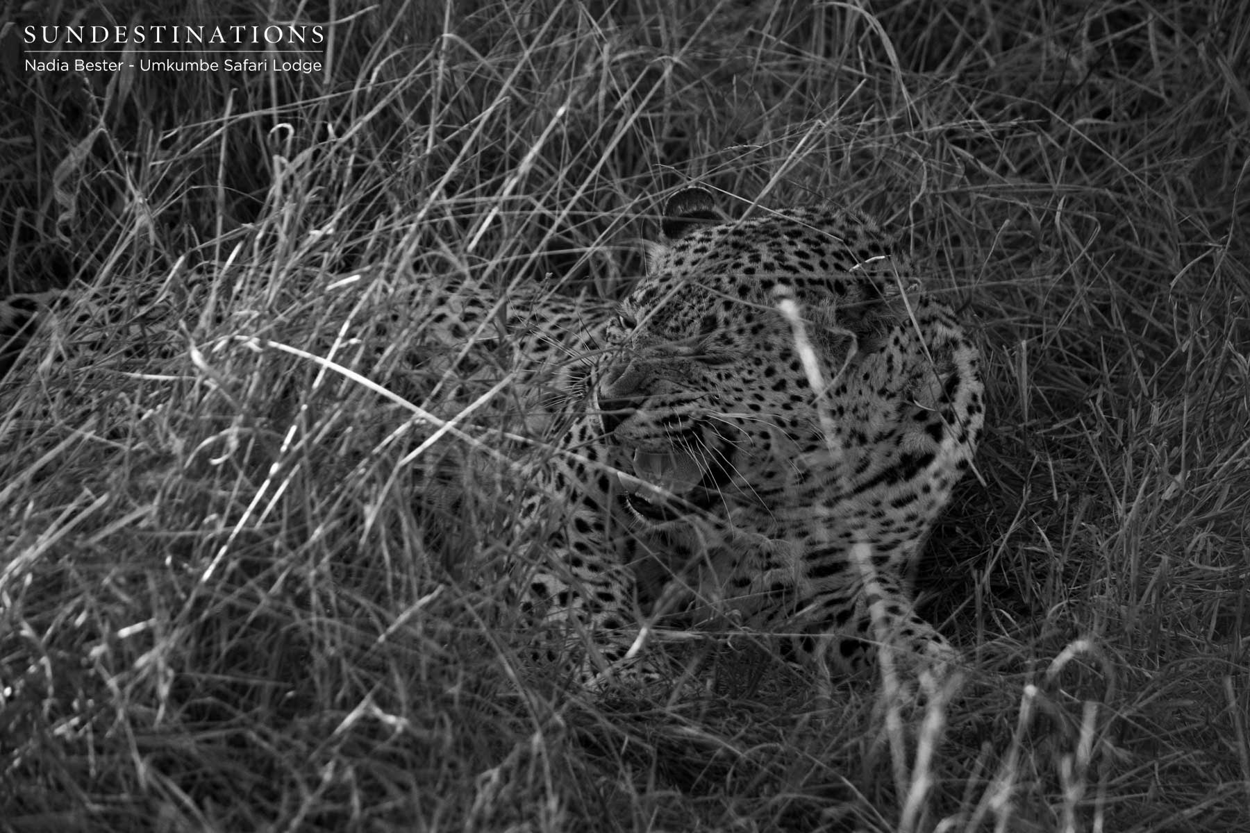 Umkumbe has also experienced a shift in big cat dynamics, especially when it came to dominant male Mxabene and White Dam’s sub-adult male cub. Guest Pedro Torres Taborda sent through a video of the unique series of events that took place on our traverse a couple of days ago. Mxabene the dominant male leopard in our area very boldly stole a kill from White Dam’s male cub. The growing cub became quite submissive when confronted by this Sabi Sand legend, but still remained in the area in the hopes of retrieving its kill. In other big cat news, the Tsalala young male lions were also spotted. Not a bad week for big cats in Sabi Sand !