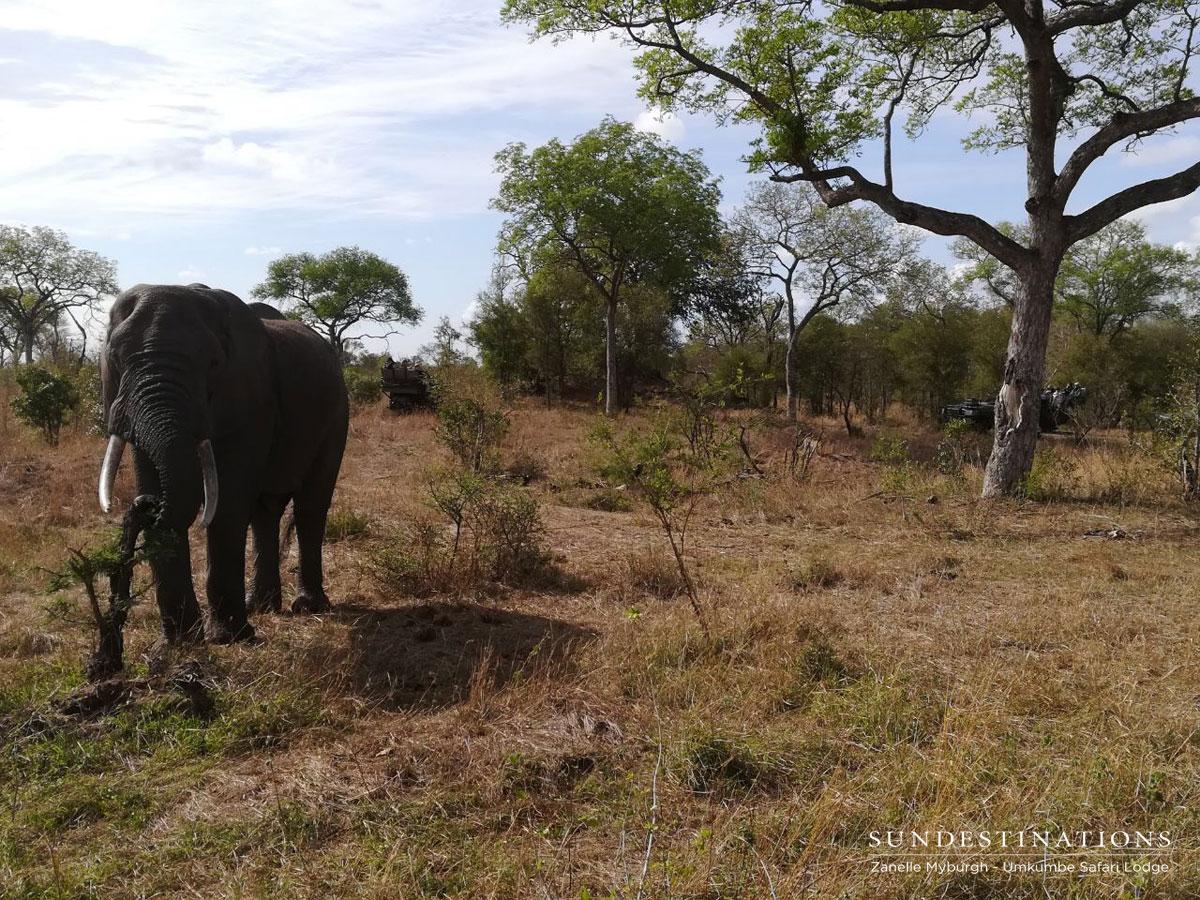 Zanelle, a ranger from Umkumbe Safari Lodge in the Sabi Sand sent through an image of an elephant in the foreground and an elusive leopard hiding in the low-lying shrubbery beneath the fork of the Marula tree. Elephants and leopards continue to enthral us with their presence, but this image we were not expecting!