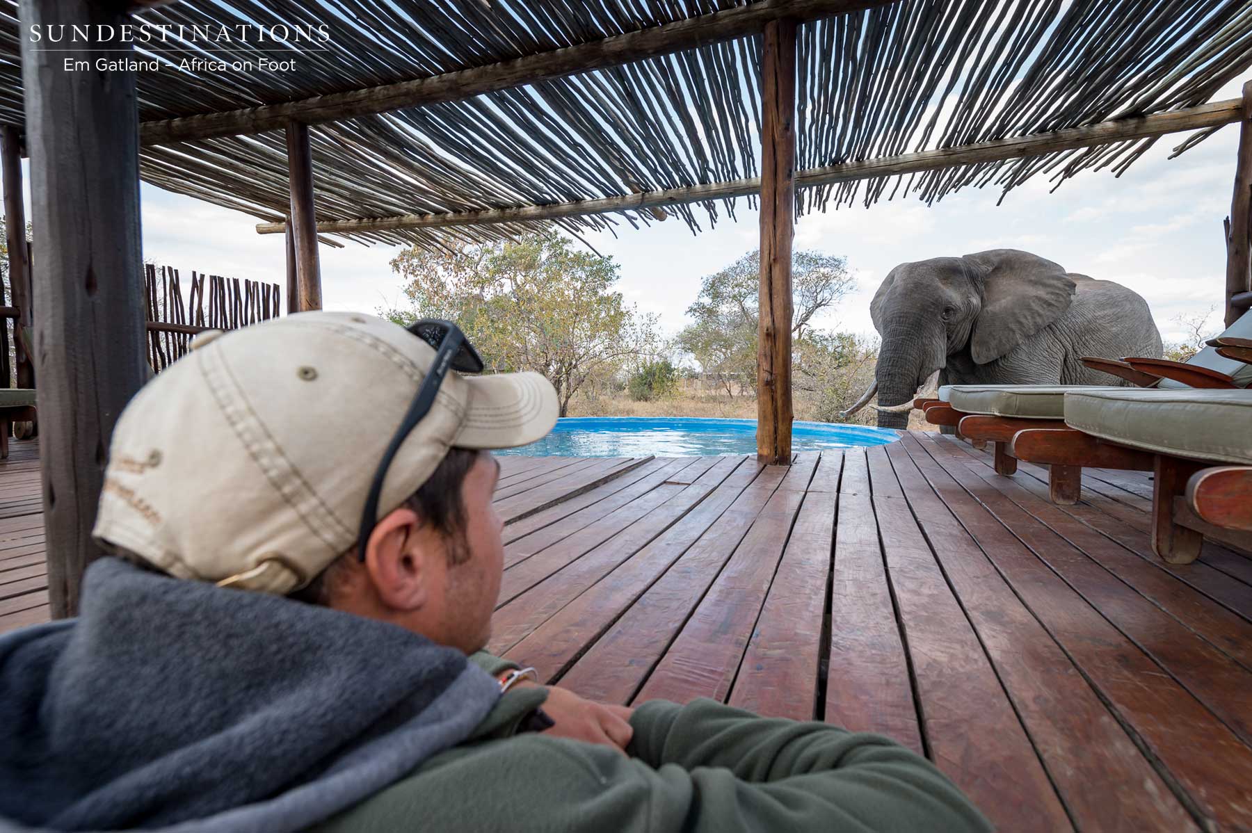 The Klaserie sister camps have also been rewarded with a plethora of big cat sightings. The Ross Pride Breakaway lionesses have been a prominent feature this week, and the Sumatra male lion was also seen enjoying their company. Then there was a sighting of burgeoning male leopard, Bundu, just relaxing in the top of a tree. We’ve had a number of elephant herds filtering through the camps, and a large bull has decided that the pool at Africa on Foot is his local watering hole!