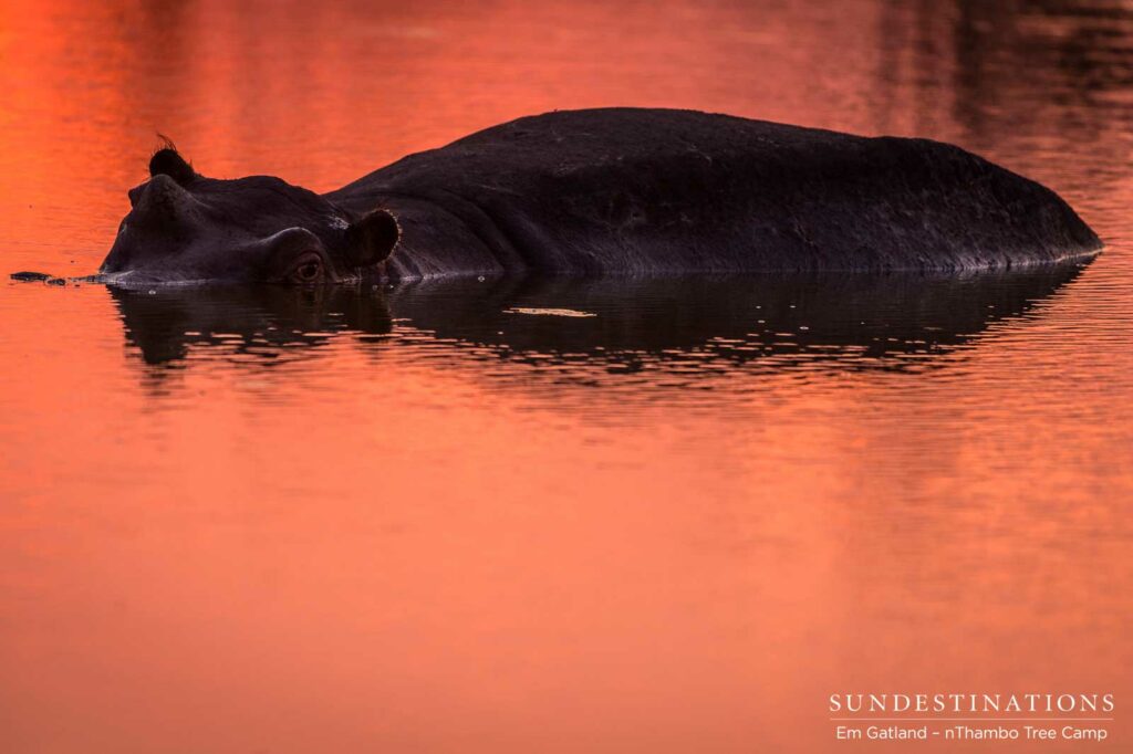 A sunset reflects vibrantly on the water as a hippo wallows and absorbs the last of the day's heat