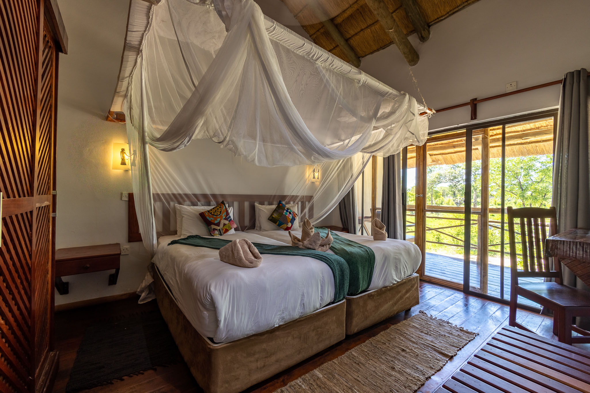 Boasting 20 bedrooms that all face the waterhole (two levels), this secluded hideaway ensures every need is met in terms of accommodation. Fans, mosquito nets, safes, private balconies with seating, and butler’s trays in each room provide a much needed sense of comfort. In addition to the luxury safari options, there are also 2 Meru style tents on raised platforms that cater for guests requiring something a little bit more luxurious.