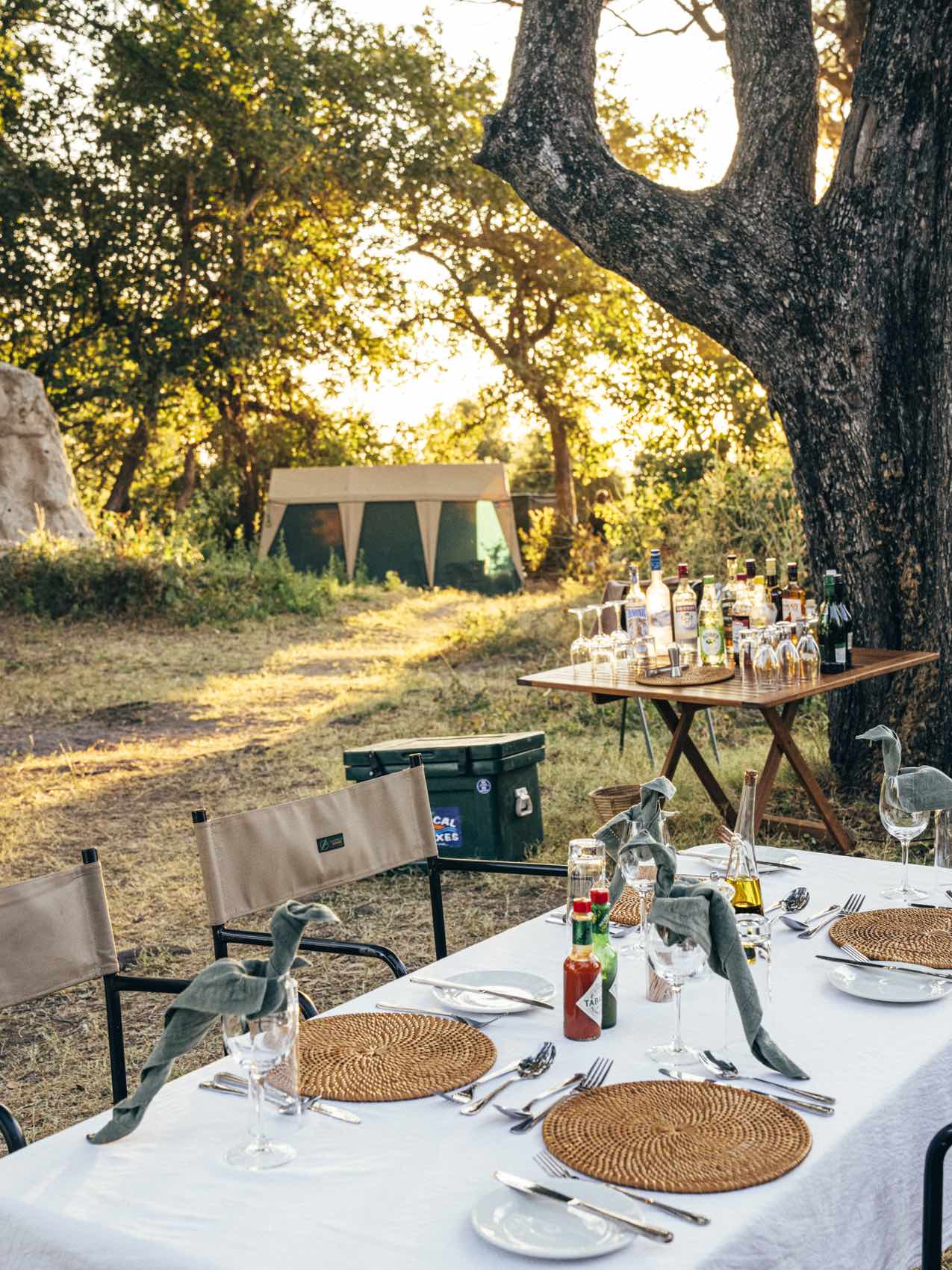 Mboma is a stylish, low-impact mobile camp offering an authentic wilderness experience. One could class the experience as glamping, but it’s a level up from glamping. 5 sturdy Meru-style tents sit under a canopy of trees that provide much needed shade during the heat of the day. Each tent has an en suite, open-air bathroom, private bucket showers, and chemical toilets. Interiors are comfortable yet plush, offering a cloud of comfort with the finest linen adorning swag style beds. Lantern lined pathways lead the way from the rooms to the main area of camp which houses a small lounge and bar area, and dining section. And, of course, there is an outdoor firepit area where many nights are spent under the starlit skies.